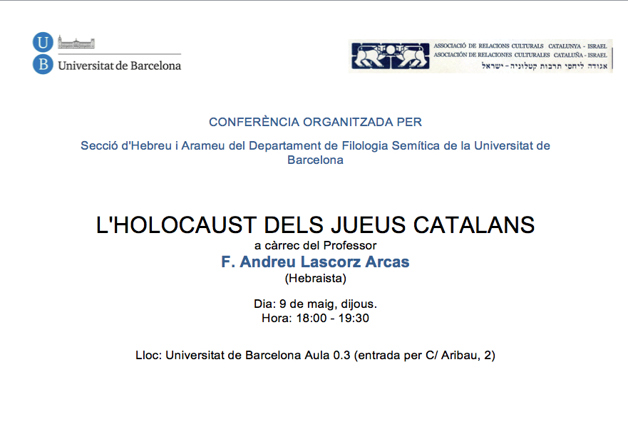 Organitzada per la Secció d'Hebreu i Arameu del Departament de Filologia Semítica de la Universitat de Barcelona, la conferència L'holocaust dels jueus catalans es realitzarà a càrrec del Professor i hebraista F.Andreu Lascorz Arcas